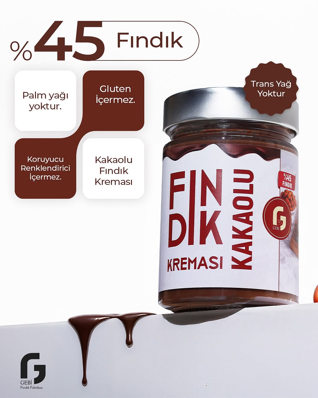 Karadeniz’in verimli topraklarında yetişen en lezzetli fındıkları çiftçilerimizden direkt alıyor, geleneksel yöntemlerle tesisimizde işliyor ve hiç bir yer de muadili olmayan %45 fındık içeriğiyle kakaolu fındık kremasına dönüştürüyoruz. Her kaşıkta kakaonun ve fındığın yoğun lezzetini hissedeceksiniz.